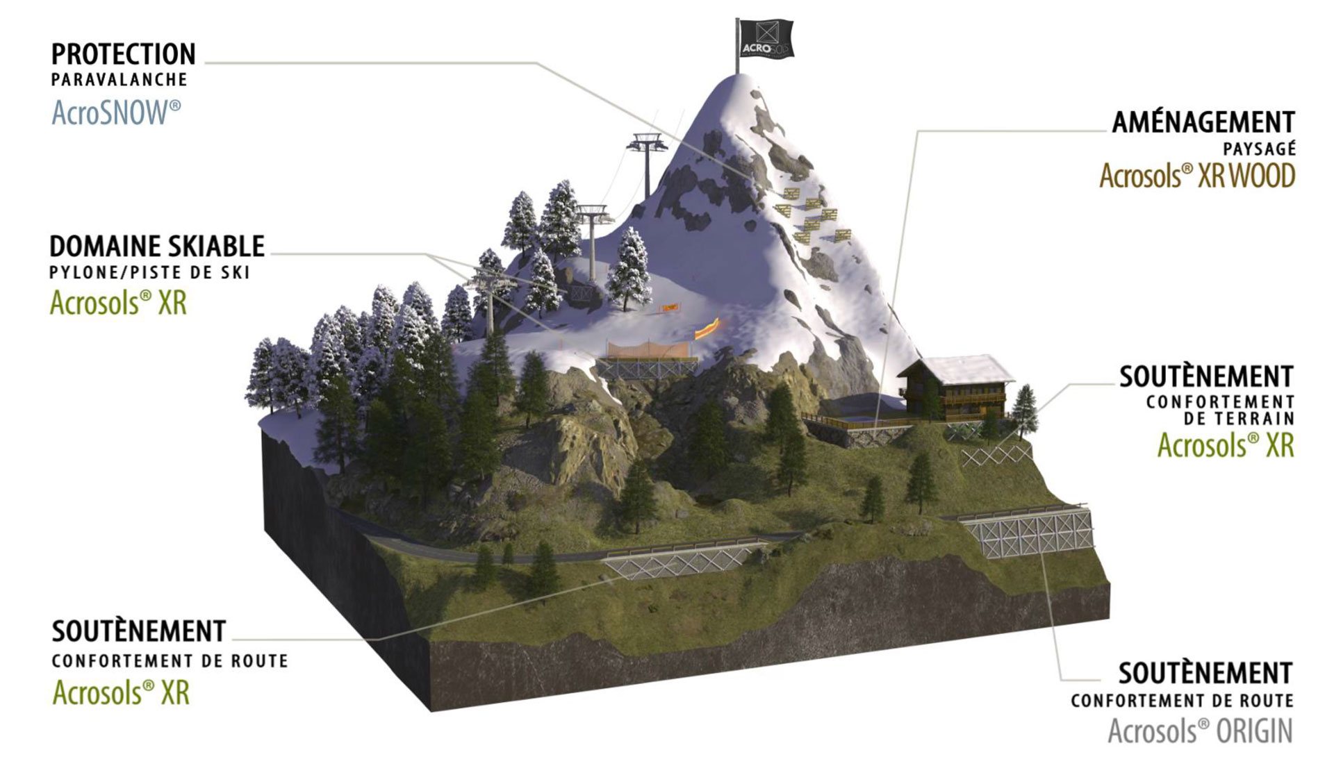 Les domaines d’applications sont multiples : création de routes, renforcement de berges ou pylônes, retenue collinaire, élargissement de terrasses une adaptation à toutes les contraintes qui fait d’ACROSOLS® LA solution idéale pour vos travaux de confortement-stabilisation de terrain ! Chez ACRO BTP, nos équipes sont formées pour la mise en œuvre des ACROSOLS® depuis la création du produit : une expérience et une connaissance du système qui nous permet d’être efficace sur tous vos projets.