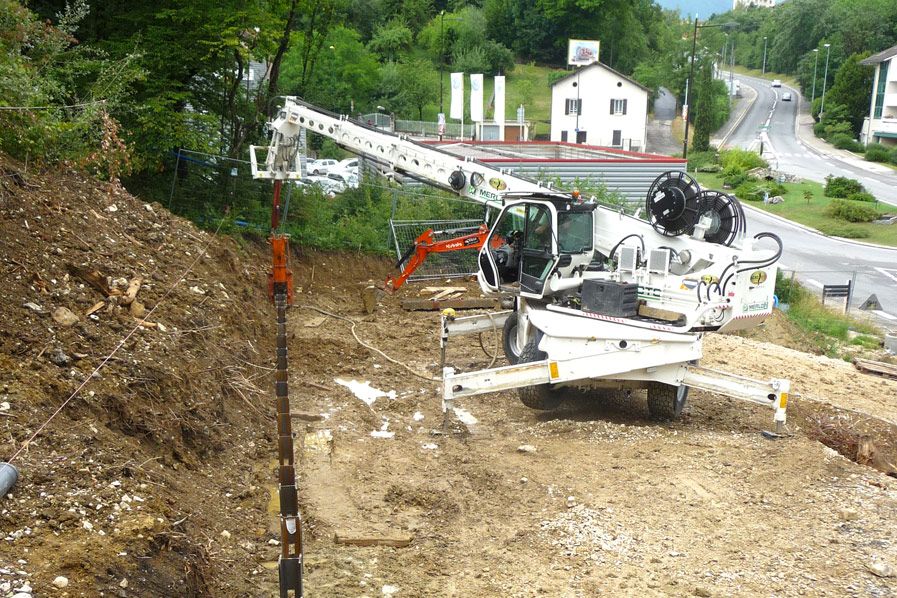 • Le soutènement du terrain est assuré par des clous autoforants associés à un treillis soudé, revêtu de béton projeté. La réalisation d’une paroi clouée se fait par passes successives.