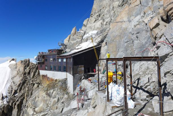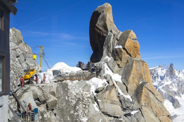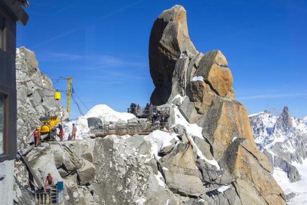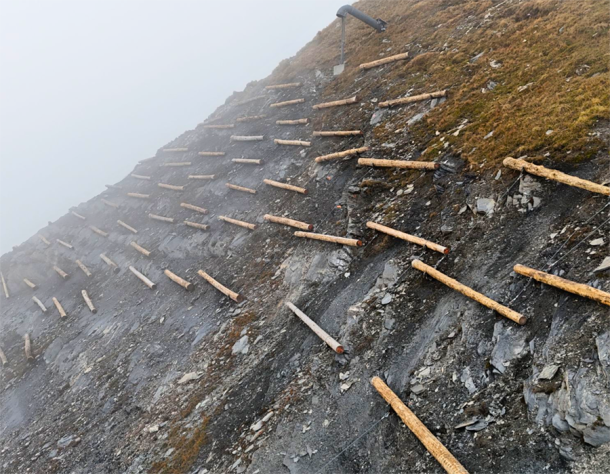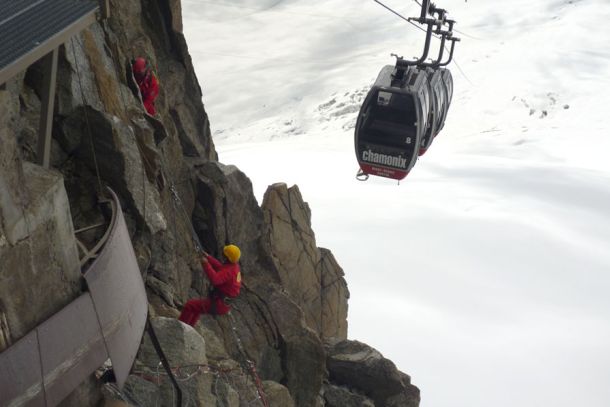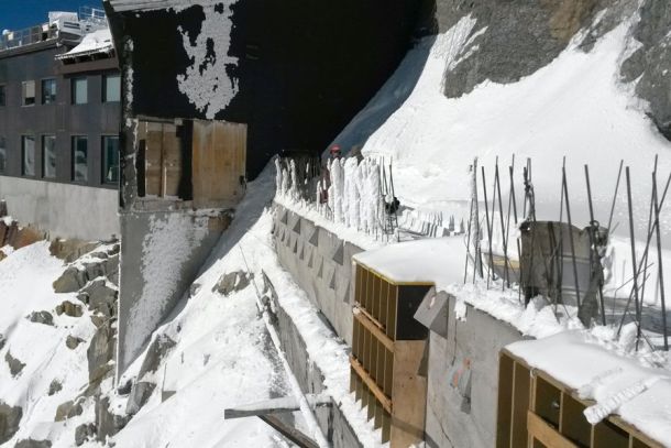 - Aiguille du Midi (Massif du Mont-Blanc) : confortement d’écailles rocheuses et pose de filets plaqués.